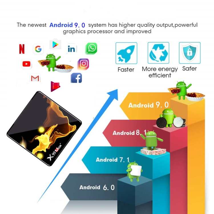 -X99 Max + 8K Smart TV Box, Android 9.0, Amlogic S905X3 Quad-Core Cortex-A55,4GB + 32GB, Hỗ trợ LAN, HDMI, 2.4G / 5G WiFi, USBx2, Thẻ TF